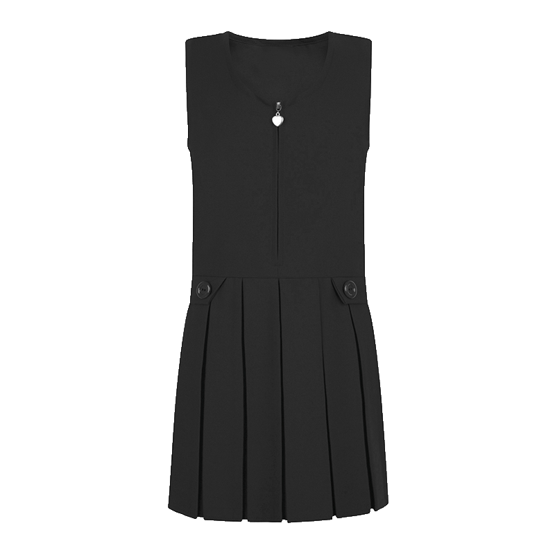 Black pinafore with all-round box pleats and a zipped front. Made from a sturdy, heavyweight polyviscose fabric. Pretty heart-detail zip pull