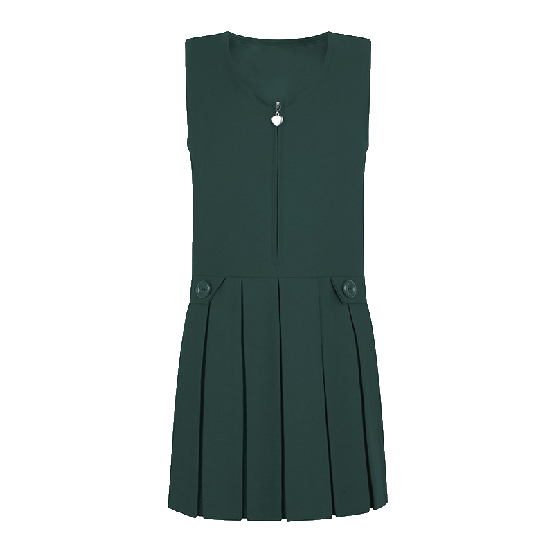 Bottle green pinafore with all-round box pleats and a zipped front. Made from a sturdy, heavyweight polyviscose fabric.