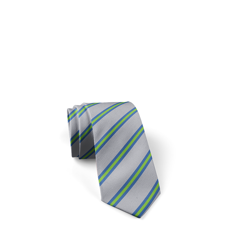 Silver grey tie with royal and green thin stripes.
