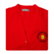 Red, corduroy, baker-boy style hat with School logo embroidered on front centre panel.